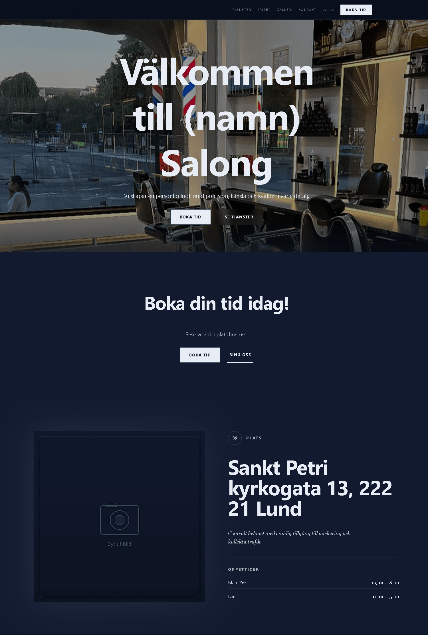 Webbplatsredigeraren ger dig en 1:1 förhandsgranskning av hur din verksamhet ser ut i både mobil och desktop. Ändra texter, byt färger och ladda upp bilder med total kontroll utan att riskera fel på din skarpa sida.